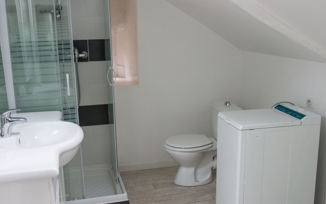 – Salle de bains avec douche, lavabo, wc, petite table ronde et machine à laver le linge